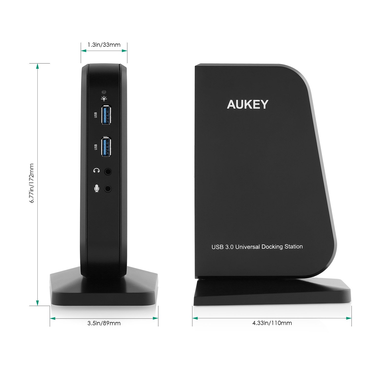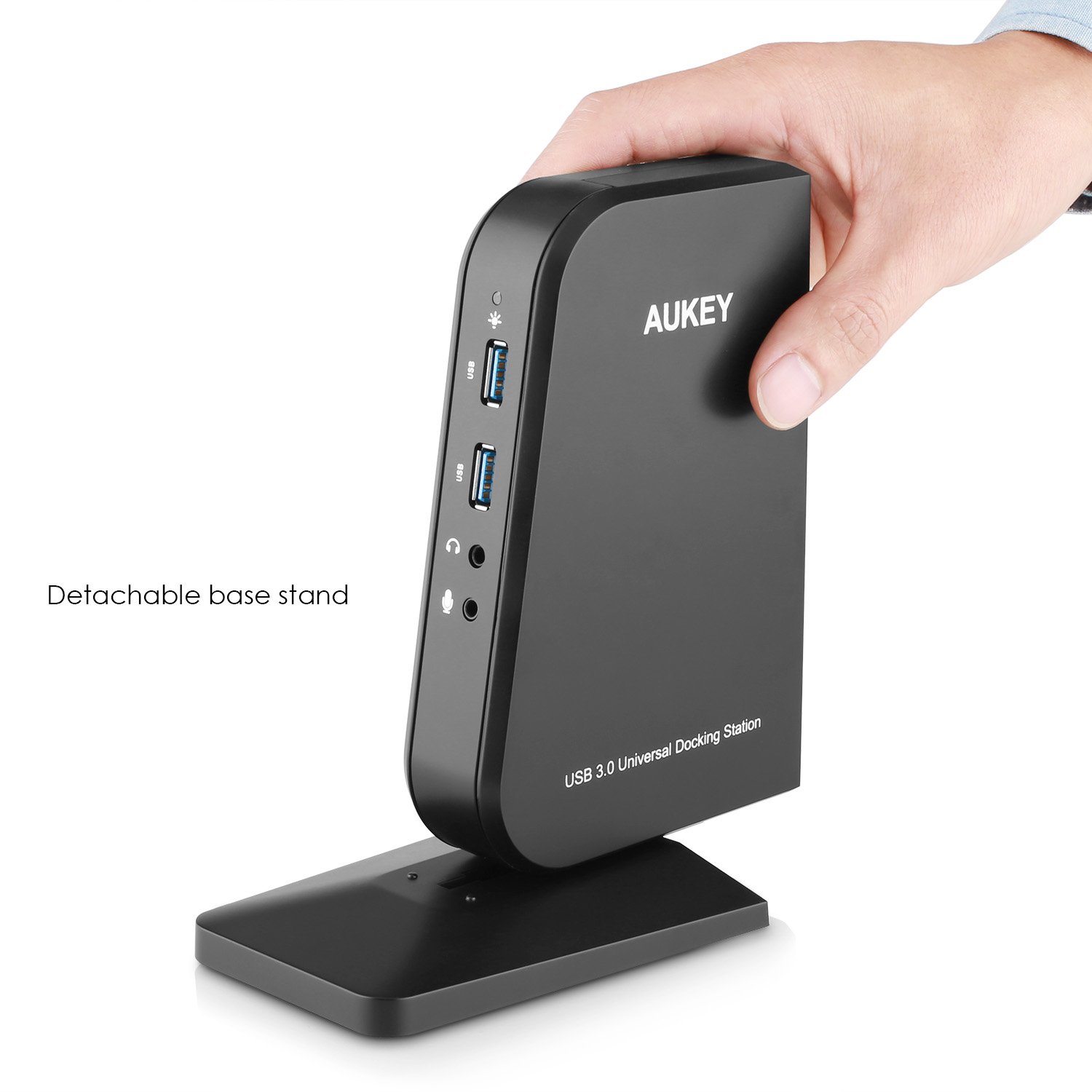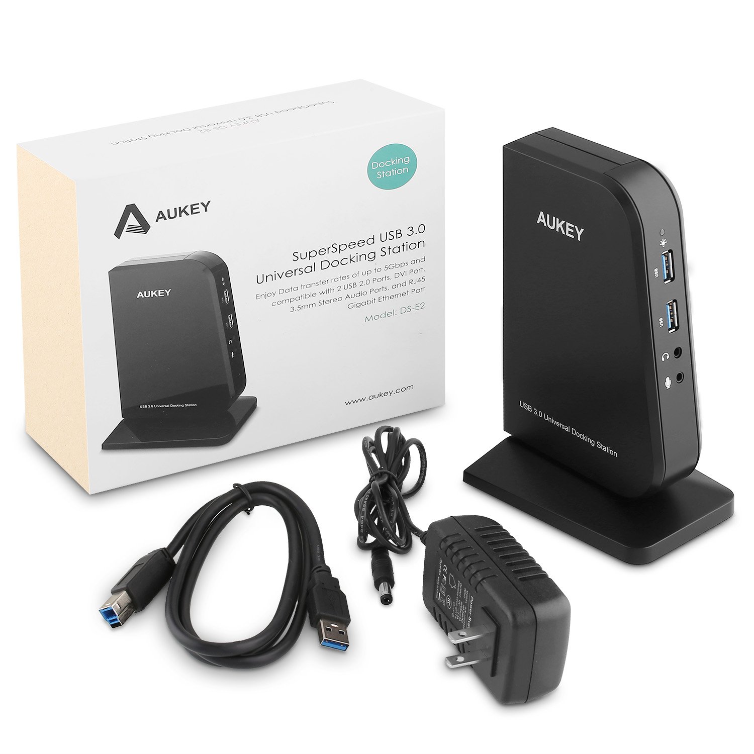 - Package contents: Aukey DS-E2 USB 3.0 universal laptop docking station, detachable base stand, USB 3.0 cable, 12V 2.5A power adapter, drive CD, and instruction manual. Free lifetime technical support and 18 months warranty.